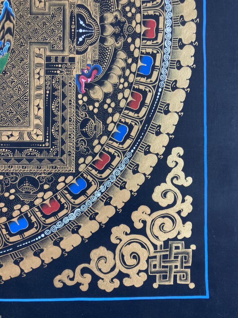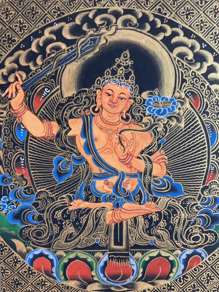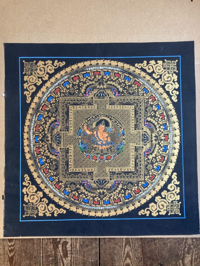 Tibetan Thangkas: Imported handmade and hand-painted Tibetan sacred Tantric Buddhist religious art. High quality contemporary pieces from the Tibetan community-in-exile in Dharamshala, India. All artworks are painted by spiritual artisans in small batches, to order for meditators, monks and yogis using traditional techniques. Trace amounts of gold and semi-precious stones are blended in the paint and inks. Each stroke is a meditation. The art is brought to life with spoken mantras as it is painted and it has been blessed and activated by Tibetan Buddhist monks at the Tsuglagkhang Temple Complex in McLeod Ganj, where the Dalai Lama lives.