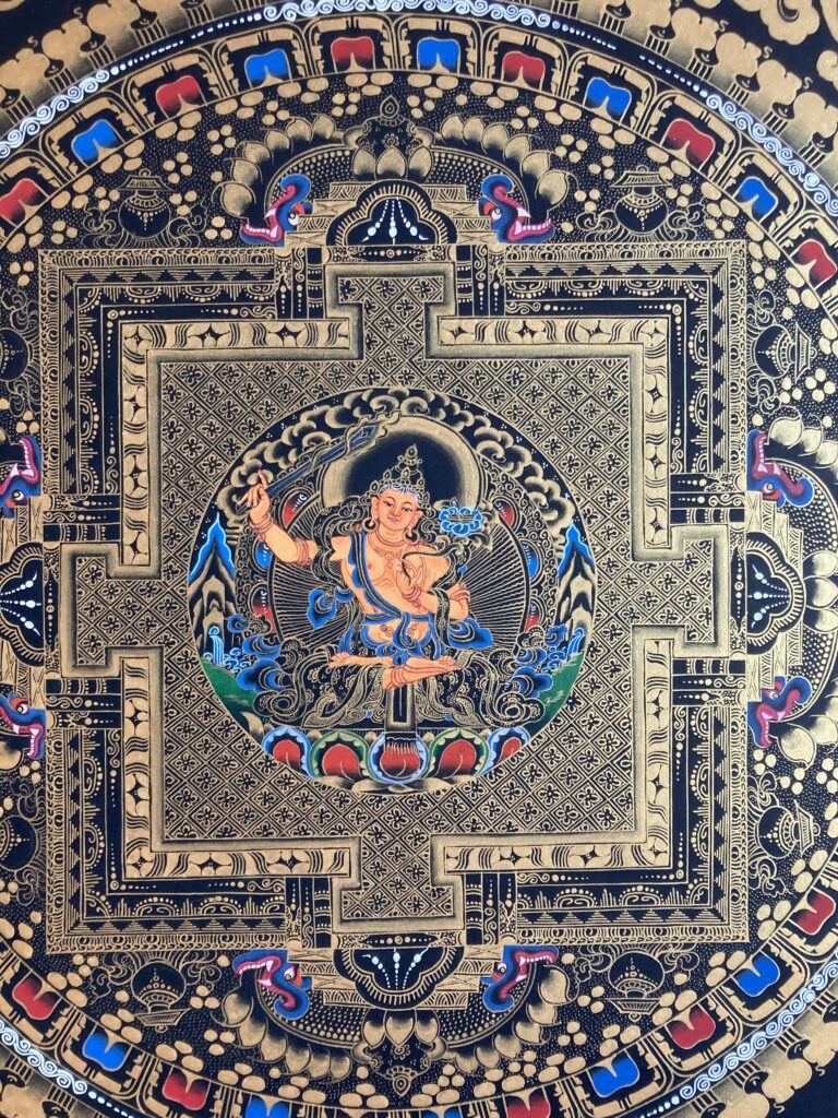 Manjushri Mandala Palace. The Buddha of Wisdom here in his dream palace, holding a flaming sword which symbolises awareness and holding a book on a lotus, which symbolises understanding. This has a larger gold content but is a simple and minimalist design to an ancient Tibetan diagram.