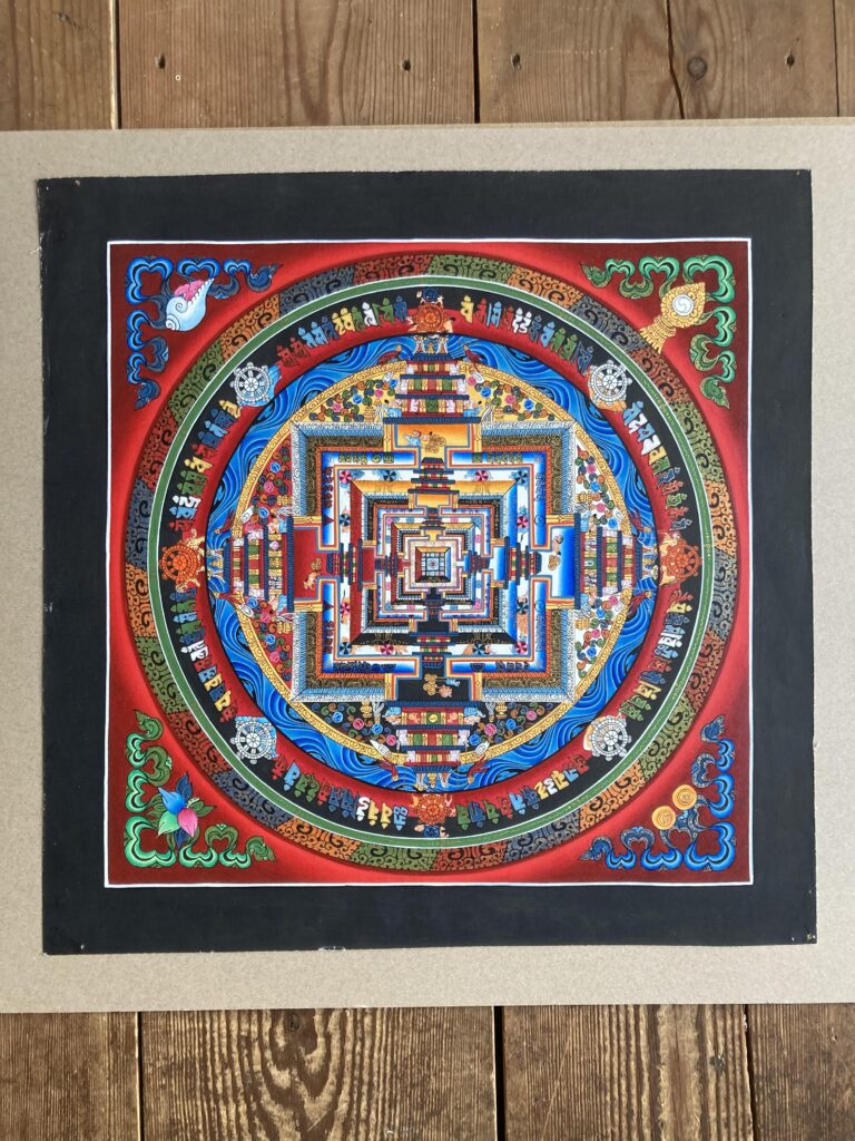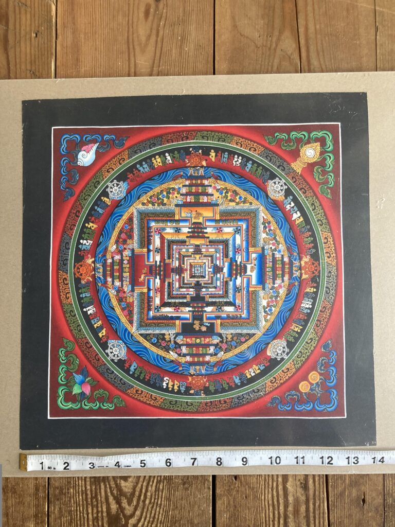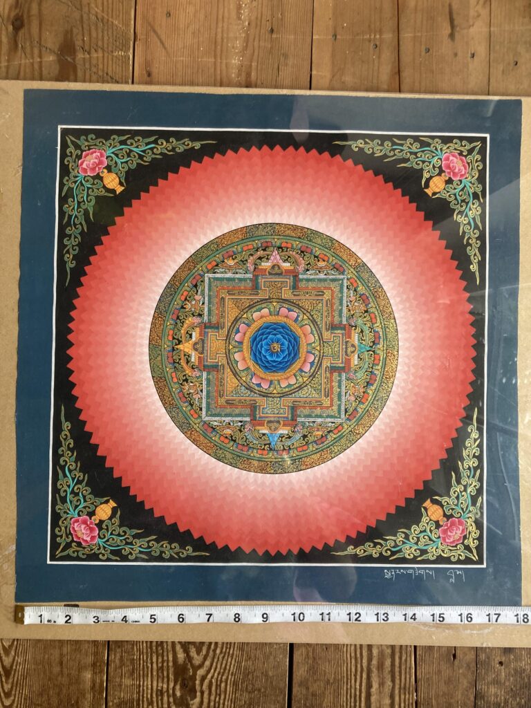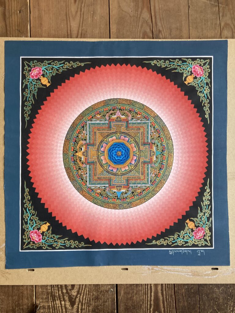This is a very sacred and beautiful mandala done to an ancient diagram. It brings warmth and harmony to all who see it. This takes many hours of painting, chanting and meditating to complete.