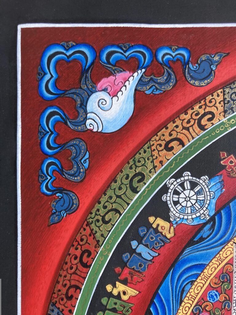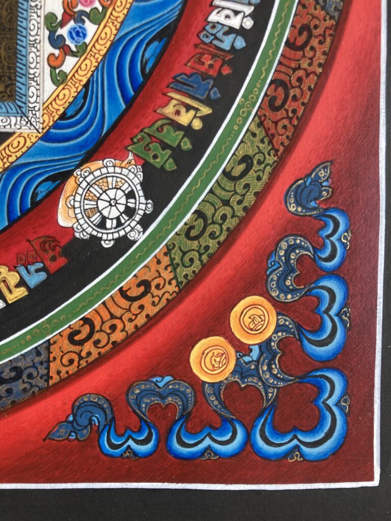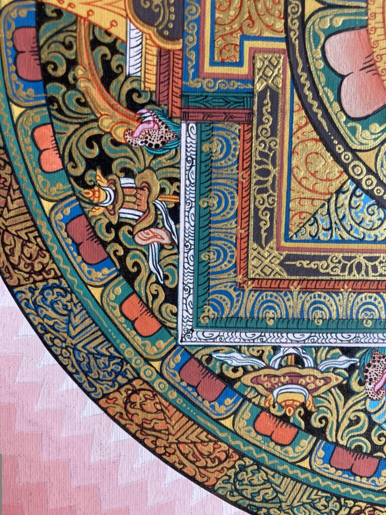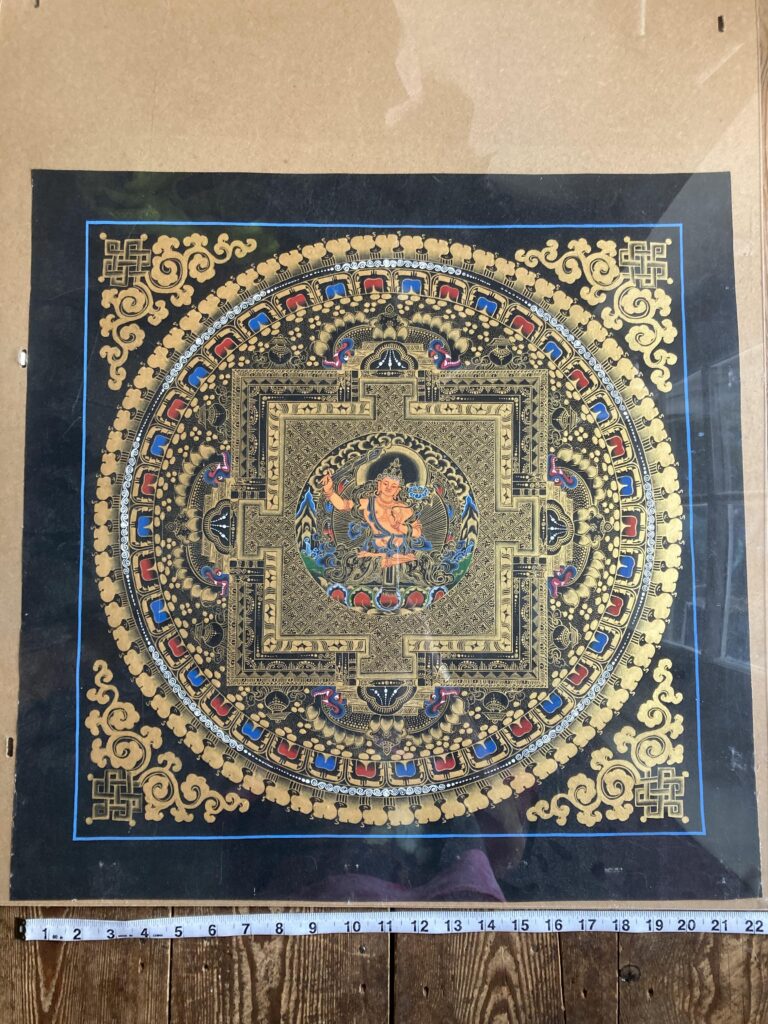 This is a very sacred and beautiful mandala done to an ancient diagram. It brings warmth and harmony to all who see it. This takes many hours of painting, chanting and meditating to complete.