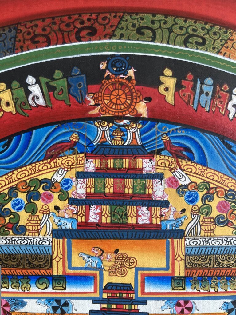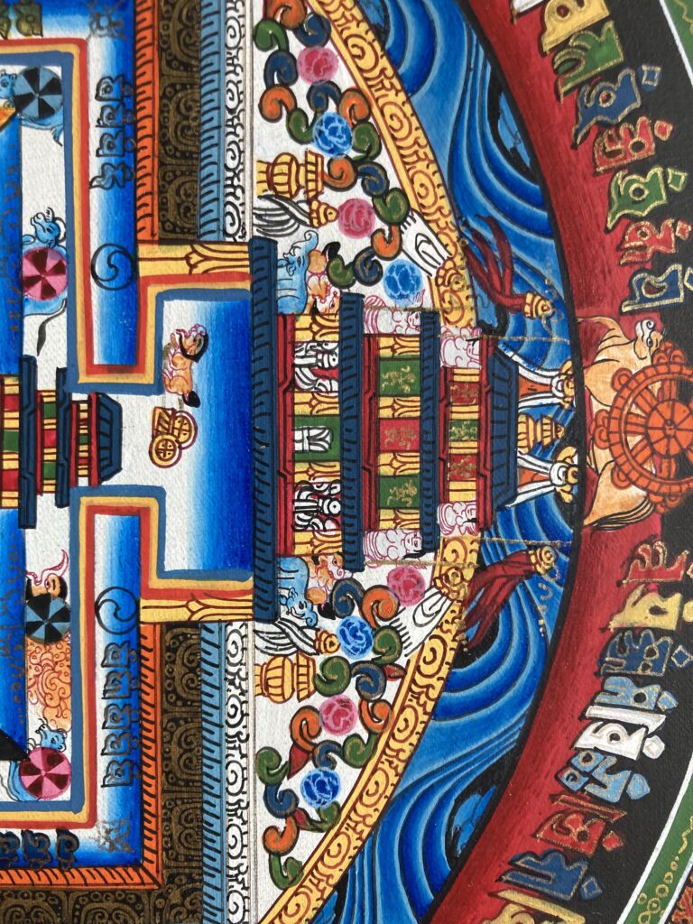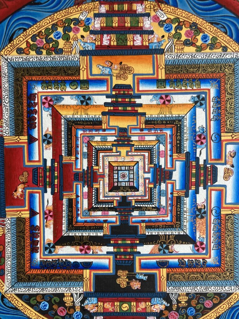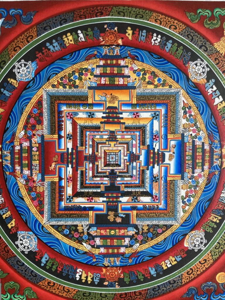 Kalachakra Tantra Palace Mandala. The ancient Tibetan diagram of the hidden temple of Shambala, painted in North Indian Himalayas, by communities of practitioners in exile. The Kalachakra, or ‘Time-Wheel’ is one of the tantras that the Dalai Lama, as a young man, smuggled out of India when the Chinese invaded Tibet. The Dalai Lama has made the blessings of the Kalachakra Tantra, a Highest Yoga Tantra, available to wide numbers of people. This ancient tantra is a profound treasure to behold and this Mandala brings peace and harmony to anyone who sees it. The Kalachakra Tantra is known for its ability to bring about enlightenment in only one lifetime.